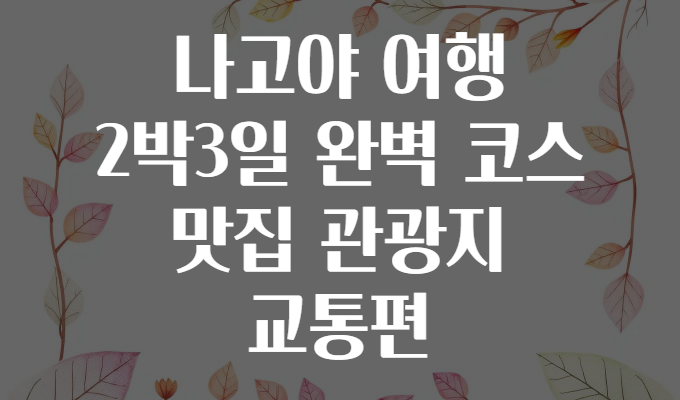 여러분, 나고야 여행 계획 중이신가요? 🤔 여행지 하나 고를 때, 음식부터 관광지, 교통편까지 다 챙기려면 머리가 복잡하죠. 특히 2박 3일이라는 짧은 일정 안에 알차게 즐기기란 쉽지 않은데요! 그래서 오늘은 여러분이 꼭 알아야 할 나고야의 꿀팁들을 총정리했어요. 맛집부터 명소, 이동 방법까지 이 글 한 편이면 나고야 여행 완벽 준비 완료! 🎒✨